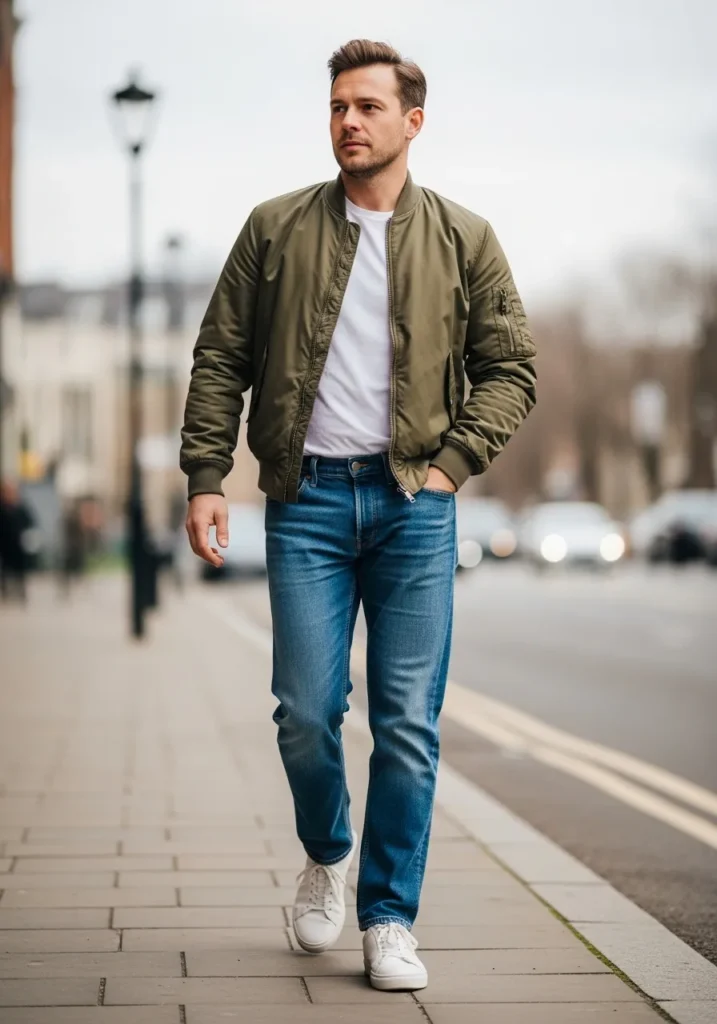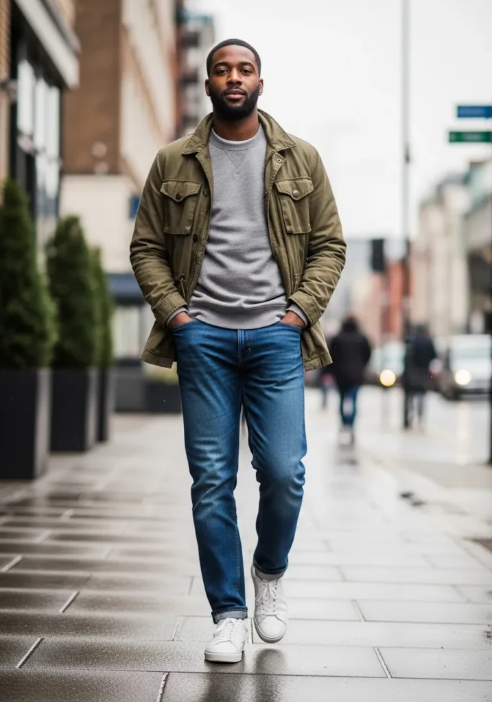 This final look features a green utility style jacket layered over a simple top, paired with blue jeans and white sneakers. The jacket adds structure while the jeans keep the look grounded.