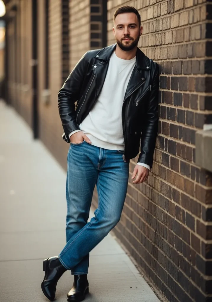 Here we see a black leather jacket layered over a light top, styled with blue jeans and dark shoes. The textures mix nicely, with the smooth leather adding edge and the denim keeping it timeless.