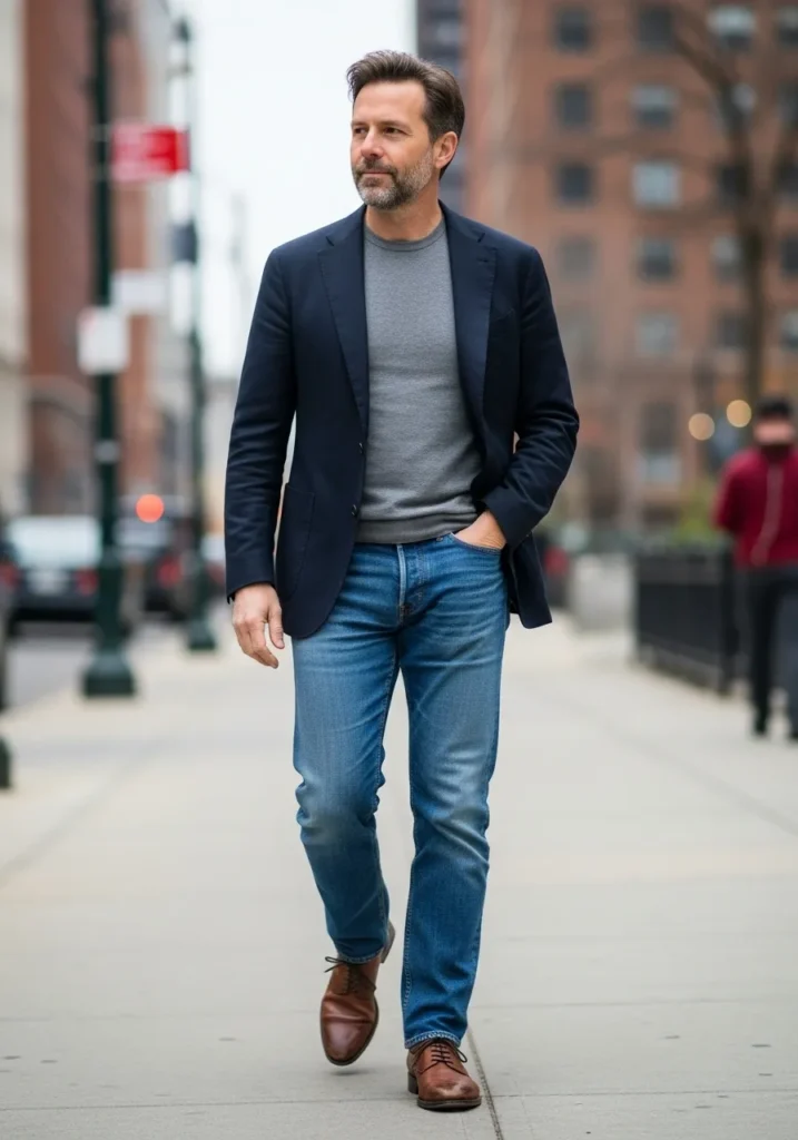 This outfit combines a navy blazer with a gray top, blue jeans, and brown shoes. The blazer adds structure while the denim keeps the outfit relaxed and wearable.