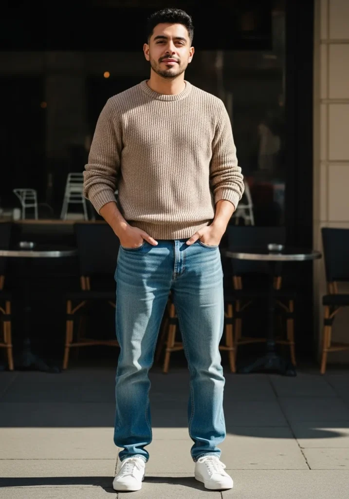 This outfit features a soft neutral sweater paired with blue jeans and white sneakers. The overall look feels cozy and balanced, with classic proportions and simple colors.