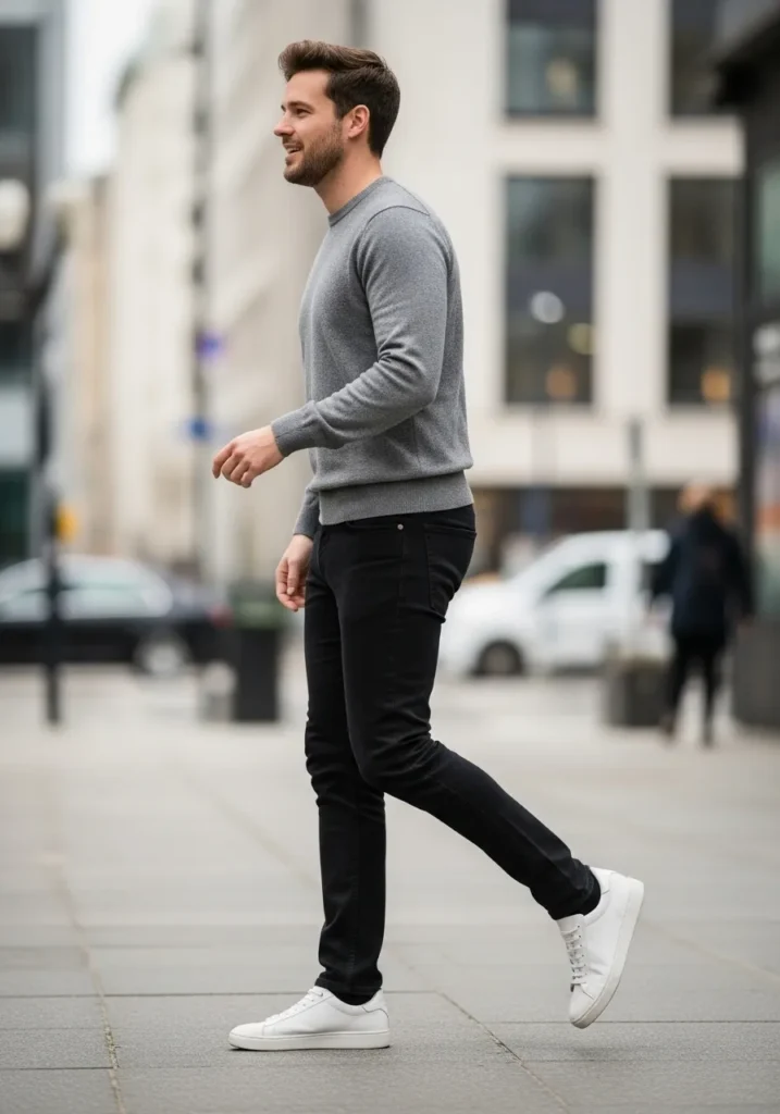 This outfit pairs a gray knit top with black jeans and white sneakers. The color palette is simple and modern, with clean lines and an easy silhouette.