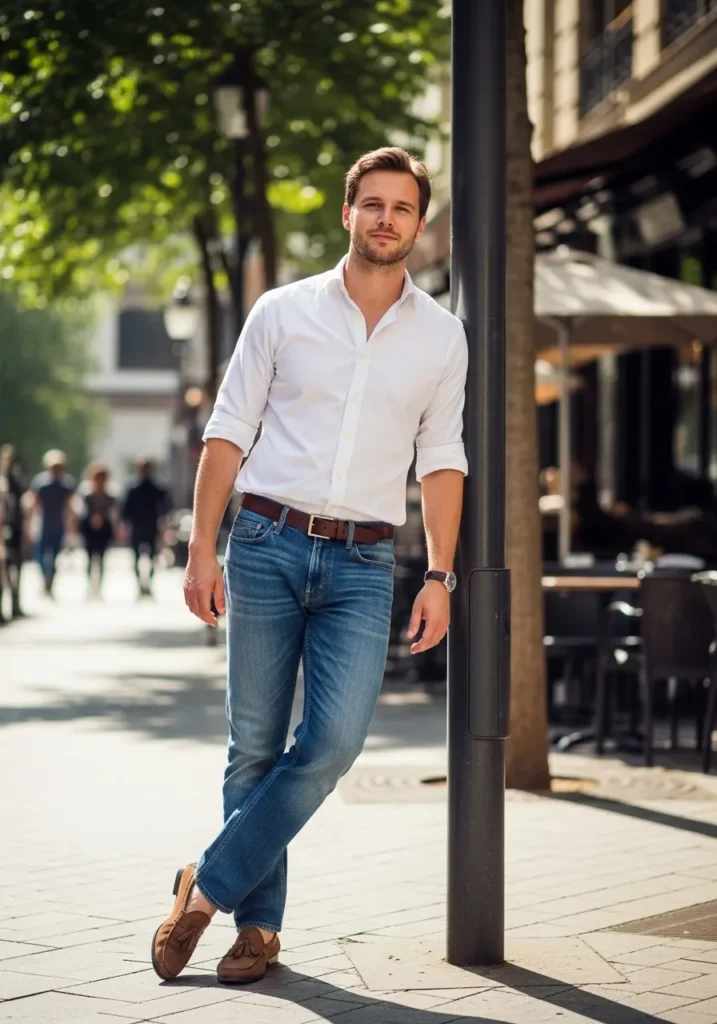 Here we have a soft white button down worn casually with mid blue jeans and brown leather shoes. The sleeves are rolled slightly, giving the whole look an effortless and laid back vibe that still feels polished.