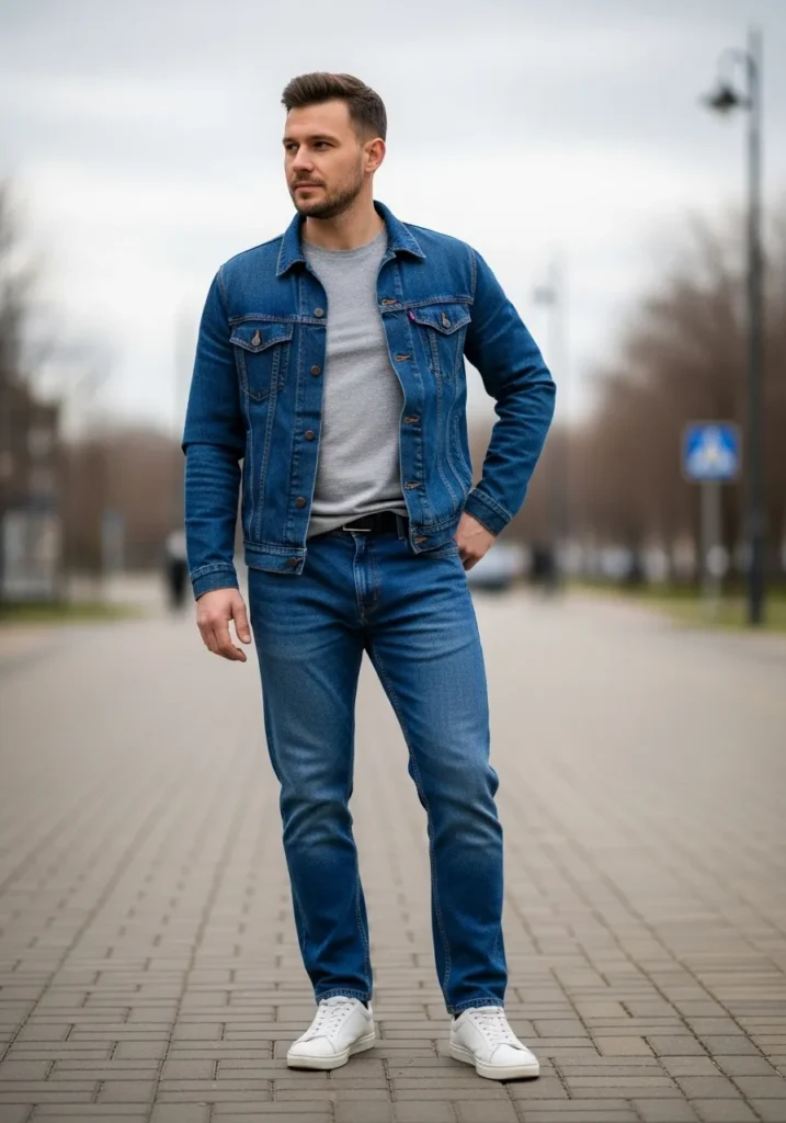 This outfit features a blue denim jacket layered over a neutral top, matched with blue jeans and white sneakers. The tones are close but not identical, which keeps the look balanced and visually interesting.