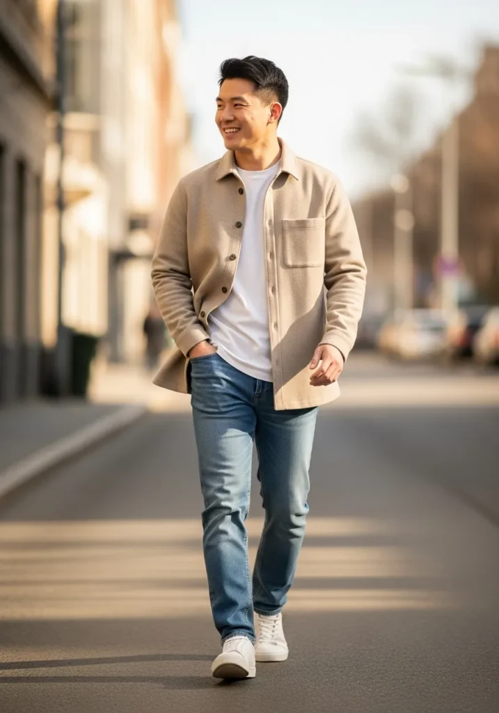 Here we see a light neutral overshirt worn over a simple top, paired with blue jeans and casual sneakers. The fabrics look soft and comfortable, giving the outfit an easygoing street style feel.