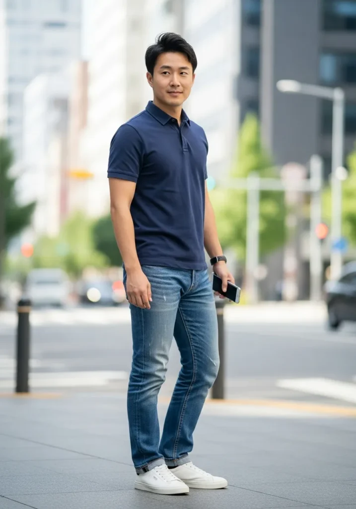 This outfit shows a navy polo shirt paired with blue jeans and white sneakers. The overall vibe is relaxed and practical, perfect for everyday city life.