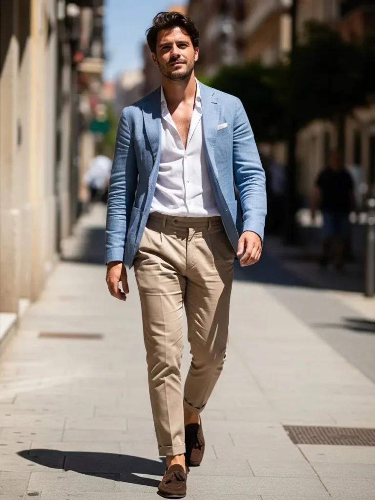 This outfit features a soft blue blazer paired with a crisp white shirt, light trousers, and classic brown loafers. The colors feel fresh and airy, while the tailoring keeps everything looking sharp. The overall vibe feels relaxed, confident, and very polished.