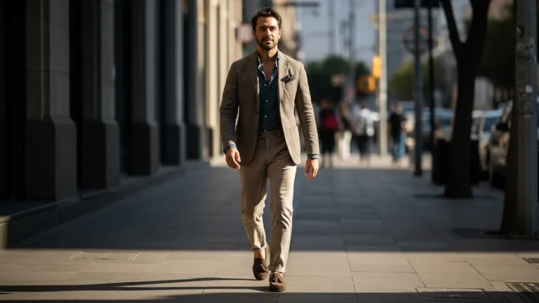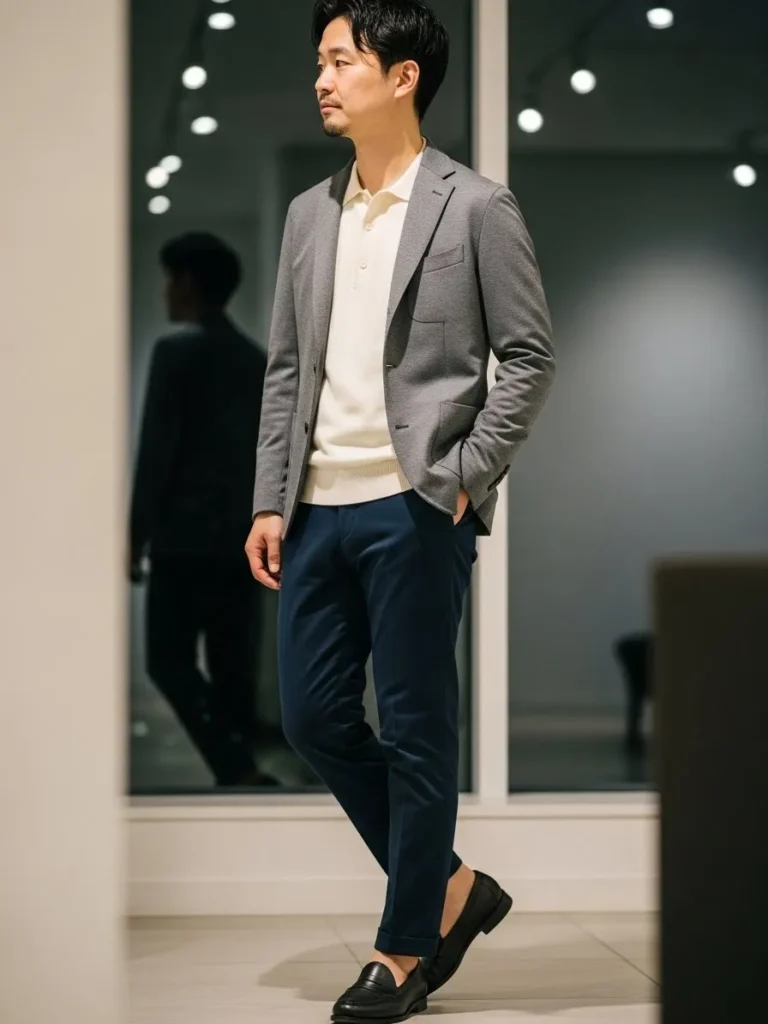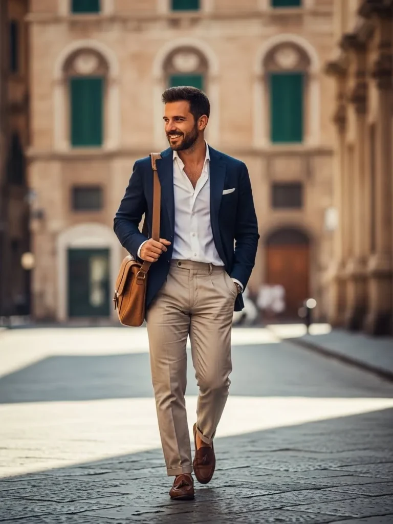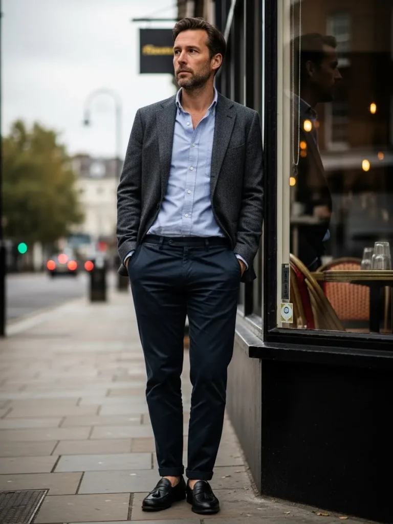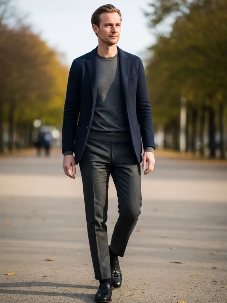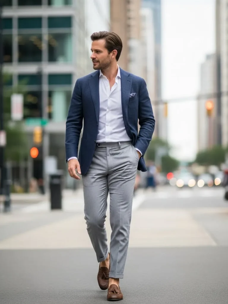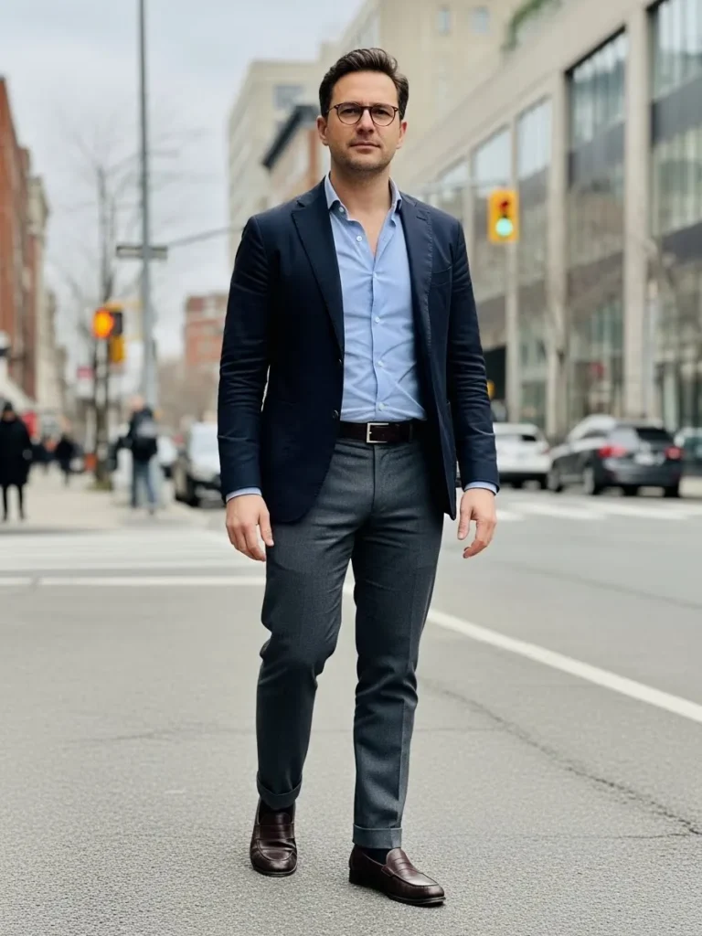 This look combines a navy blazer with a light shirt, grey tailored trousers, and brown loafers. The color pairing feels timeless and clean, perfect for city settings. The fit feels sharp but not stiff.