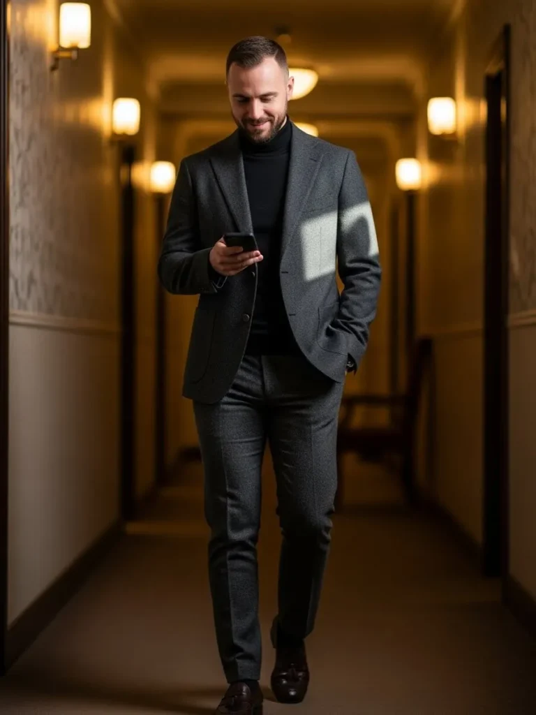 This outfit features a darker tailored jacket paired with slim trousers and polished loafers. The palette stays deep and refined, giving the look a sleek and confident feel. It looks smart and very put together.