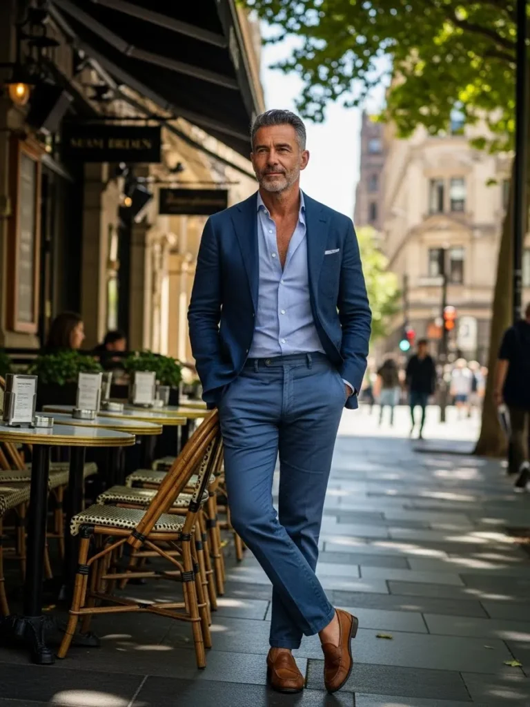 This outfit shows a blue suit styled with an open shirt and warm brown loafers. The tailoring looks relaxed, and the color contrast feels classic and welcoming. It has a confident, café ready charm.
