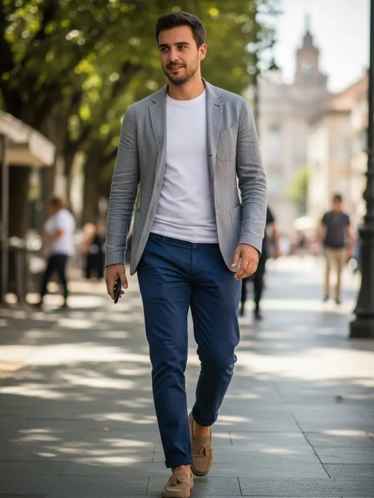 This look combines a soft grey blazer with a white tee, blue trousers, and leather loafers. The mix of casual and tailored pieces feels balanced and modern. Everything fits cleanly and looks easy to wear.