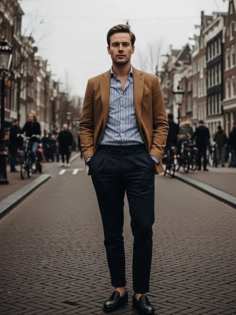 This look features a warm brown jacket styled with a soft shirt, dark trousers, and loafers. The earthy tones add depth and personality, while the tailoring keeps it sharp. It feels stylish and grounded.