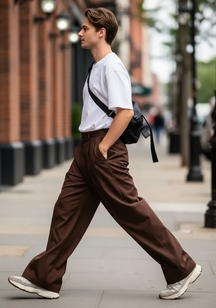 This look is all about flow and confidence. He is wearing rich chocolate brown wide leg trousers with soft pleats and a silky drape that moves beautifully as he walks. The fabric falls in loose, fluid lines and creates that effortless street style silhouette we all secretly love. On top, he keeps it simple with a light gray oversized T shirt tucked in just enough to define the waist. Chunky off white sneakers add a sporty touch, and the black crossbody bag gives it that modern city vibe that feels practical but cool.