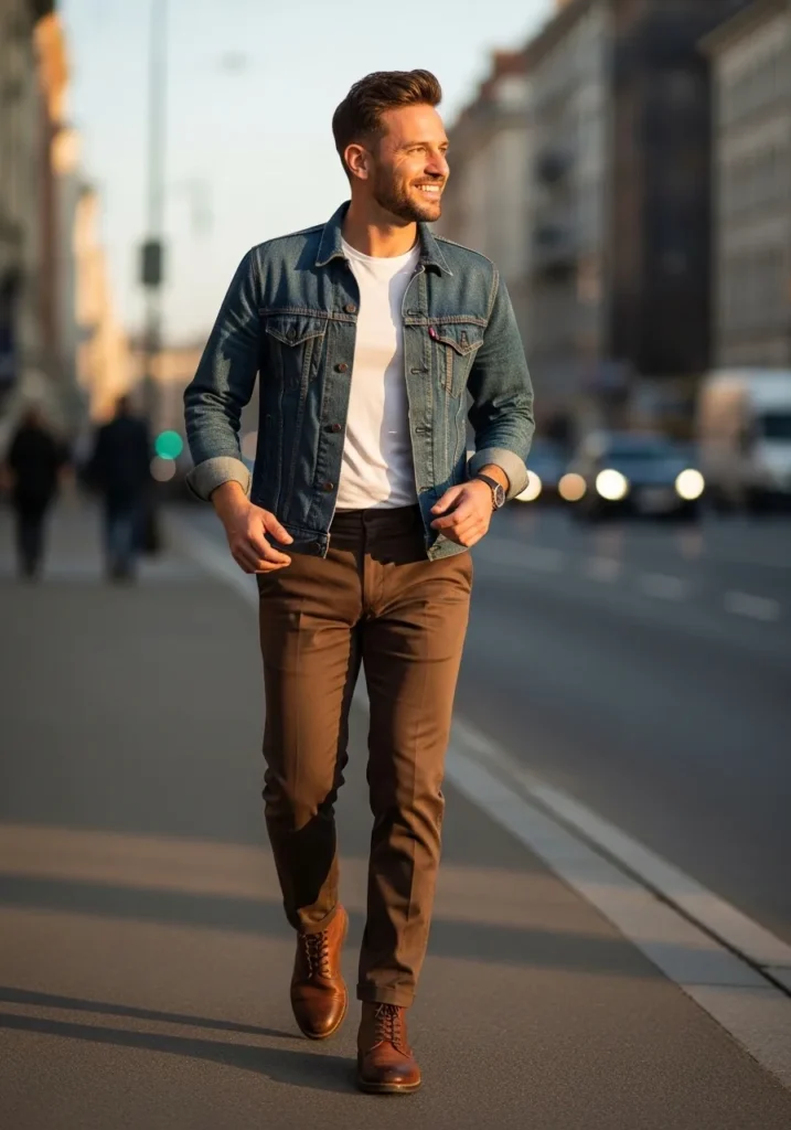 This look is that perfect everyday street combo that never fails. He is wearing slim fit brown pants with a clean tailored shape that follows the leg without feeling tight. The fabric looks smooth with a slight structure that keeps everything sharp. On top, he layers a classic blue denim jacket over a simple white T shirt, which instantly adds that relaxed city vibe. Brown leather boots finish the outfit and tie beautifully into the warm tone of the pants, making the whole look feel cohesive and intentional.