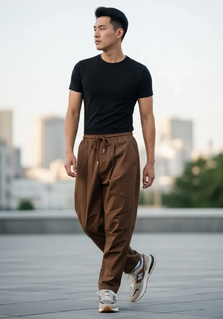 This look is clean, modern, and slightly sporty in the best way. He is wearing relaxed brown drawstring pants with a soft drape and subtle panel details that give them a contemporary feel. The elastic waistband and visible tie add that casual touch, while the fabric falls smoothly with natural folds as he walks. On top, he keeps it sleek with a fitted black T shirt that creates a sharp contrast against the warm brown tone. Neutral sneakers finish the outfit and keep it grounded in everyday street style.