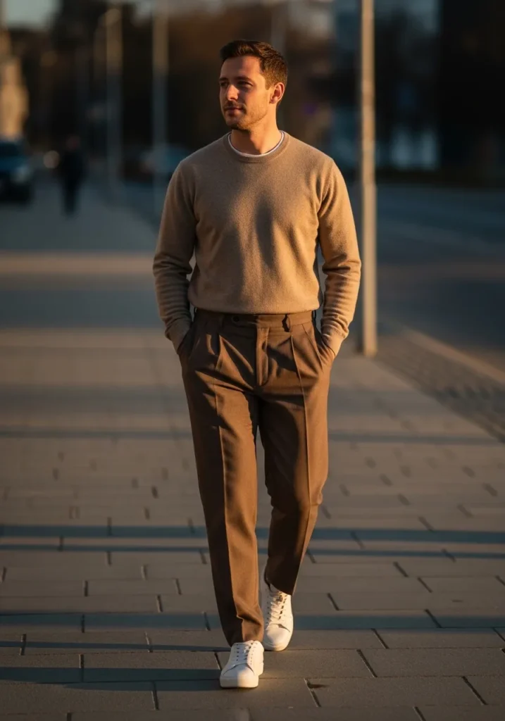 This look feels soft, clean, and quietly stylish. He is wearing tailored brown trousers with subtle pleats and a smooth finish that catches the golden light beautifully. The fit is slim but comfortable, with natural folds that add movement as he walks. On top, he pairs them with a light camel knit sweater layered over a simple white tee that peeks out slightly at the collar. Crisp white sneakers keep the outfit fresh and modern, balancing out the warm earthy tones.