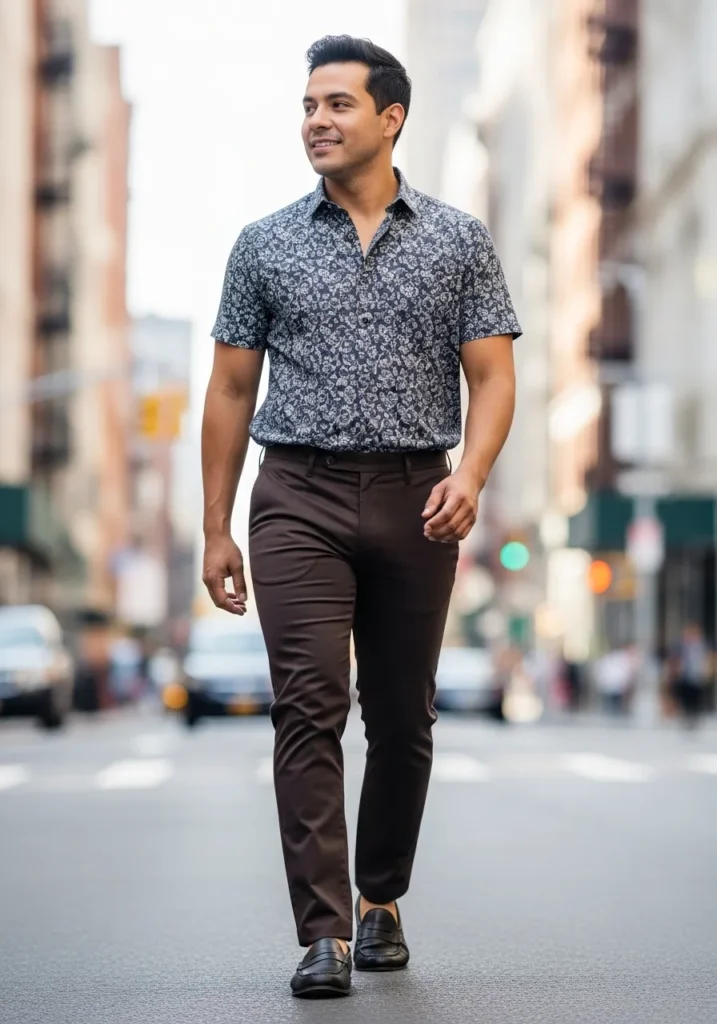 This look feels sharp but still full of personality. He is wearing dark brown slim fit trousers with a smooth tailored finish that gives his legs a long clean line. The fabric sits close to the body without looking tight, which keeps it modern and flattering. On top, he pairs them with a short sleeve button down in a bold black and white print that adds instant visual interest. Black loafers complete the outfit and keep everything sleek and city ready.