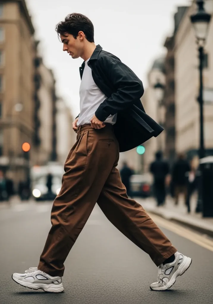 This look feels bold and fashion forward without losing that everyday ease. He is wearing wide leg brown trousers with soft pleats and a fluid drape that creates strong movement as he walks. The fabric falls naturally and gives the pants a relaxed but intentional shape. On top, he keeps it simple with a clean white T shirt and a lightweight black jacket that adds contrast and structure. Chunky white sneakers bring in that sporty edge and keep the whole outfit grounded in street style.