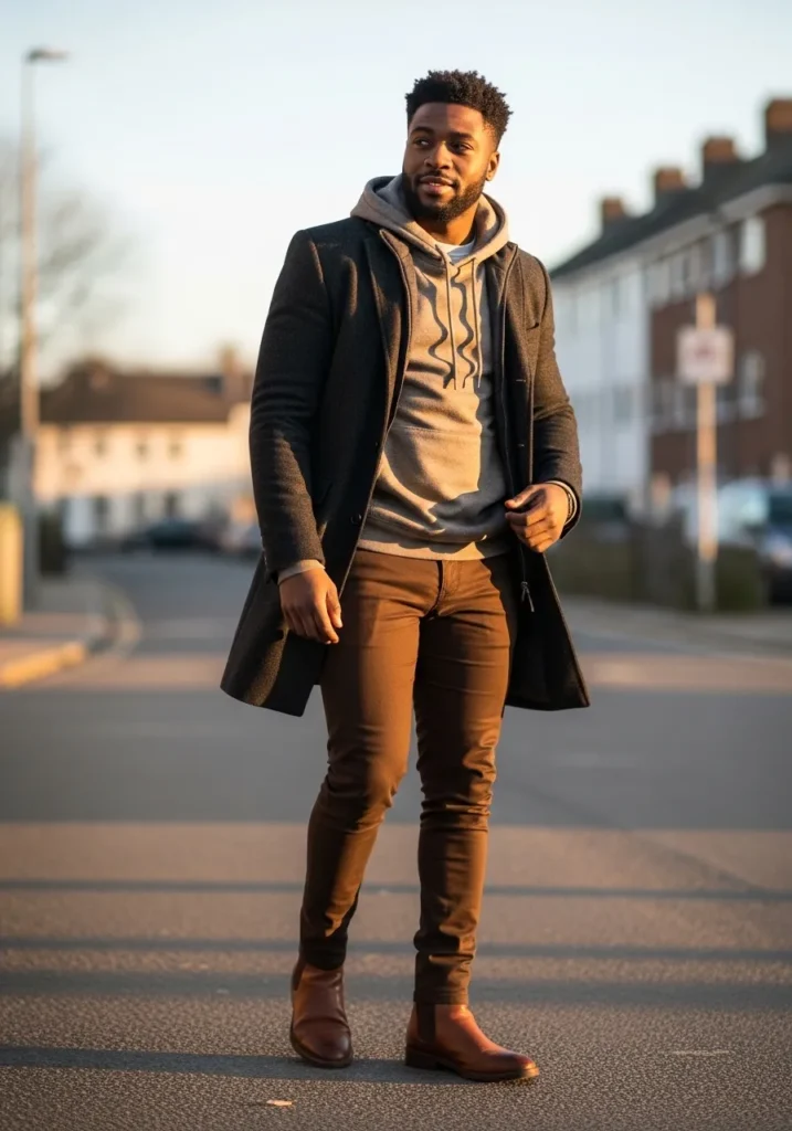This look is such a great mix of cozy and sharp. He is wearing slim brown pants that fit close to the leg and create a clean streamlined shape. The fabric looks smooth with natural creasing at the knees that makes it feel lived in and real. On top, he layers a soft gray hoodie under a dark tailored overcoat, which adds depth and dimension to the outfit. Brown leather boots tie in perfectly with the pants and give the whole look a polished finish.