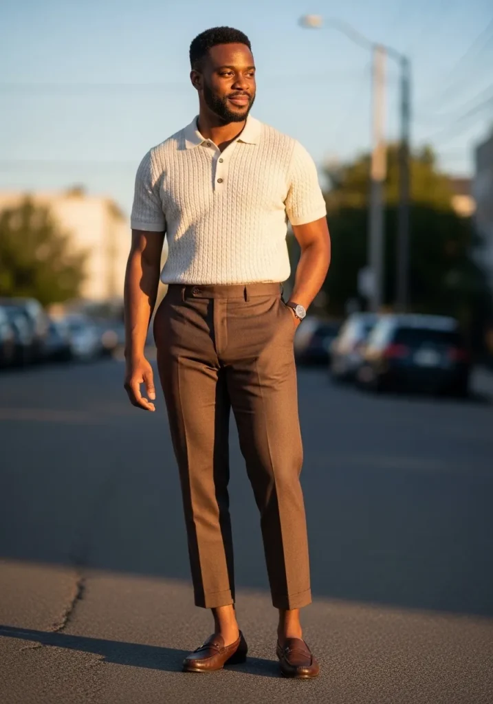 This outfit feels sleek but still relaxed in the best way. He is wearing tailored medium brown trousers with a clean slim fit and cropped hem that shows just a hint of ankle. The fabric looks smooth and structured, giving the pants a sharp silhouette. On top, he pairs them with a cream short sleeve knit polo that has subtle texture and a soft drape. Dark brown leather loafers pull everything together and add that refined touch without feeling stiff. The whole look catches the warm golden hour light beautifully and gives off effortless street style energy.