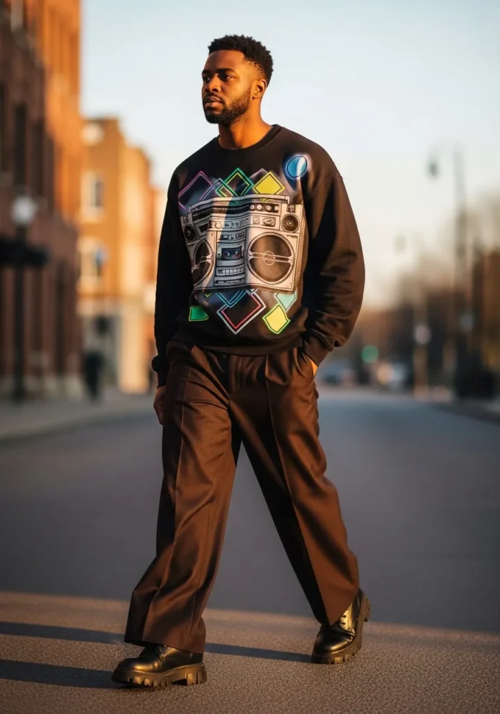 This look is street style with serious personality. He is wearing wide leg brown trousers with a smooth drape and strong silhouette that creates movement with every step. The fabric falls cleanly and gives the pants a tailored yet relaxed feel. On top, he goes bold with a black graphic sweatshirt featuring a colorful retro print that instantly grabs attention. Chunky black loafers add weight to the outfit and keep the proportions balanced from head to toe.
