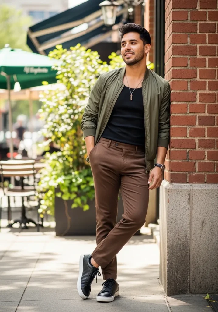This outfit feels like the perfect mix of polished and relaxed. He is wearing slim fit brown trousers with a smooth finish and a clean tailored shape that hugs the leg just right. The fabric looks structured but still comfortable, which keeps it wearable for everyday city life. On top, he pairs them with a fitted black T shirt and an olive green bomber jacket that adds a cool street edge. Black leather sneakers keep the look grounded and modern, while a simple necklace and watch add subtle personality.