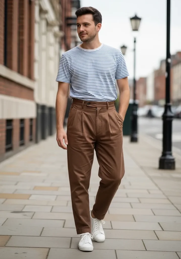 This outfit gives that clean city boy charm without feeling overdone. He is wearing high waisted brown pleated trousers with a smooth finish and a soft structured drape. The pleats add subtle volume at the top, while the legs taper down neatly for a polished shape. On top, he keeps it light with a blue and white striped T shirt tucked in for a defined waist. Crisp white sneakers bring a fresh contrast and keep the whole look grounded in everyday street style.