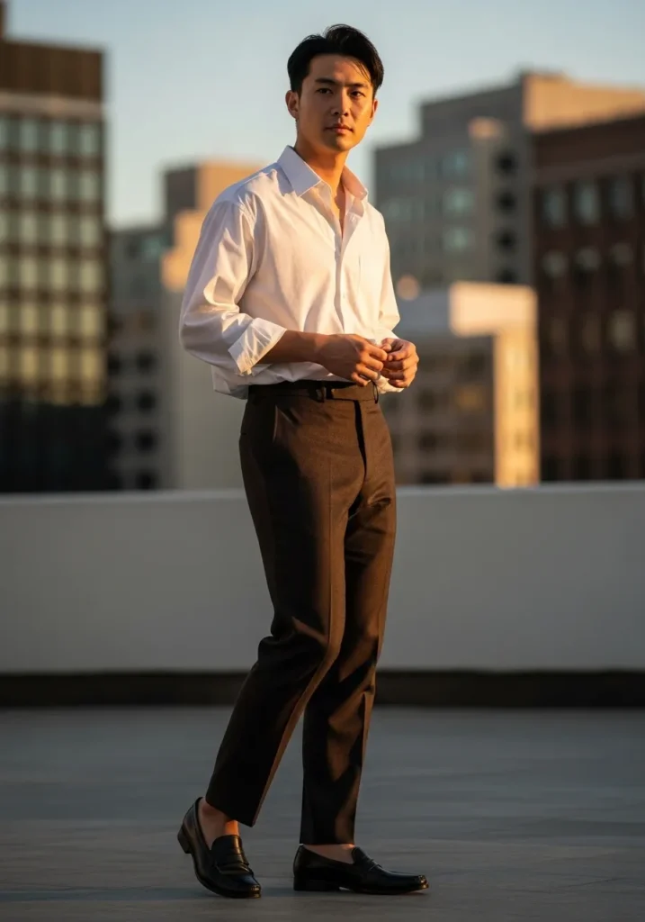 This look is pure understated confidence. He is wearing dark brown tailored trousers with a clean slim cut and a sharp crease down the front that elongates the legs. The fabric looks smooth and structured, giving that polished finish without feeling stiff. On top, he keeps it classic with a crisp white button down shirt worn slightly open at the collar for a relaxed touch. Sleek black loafers complete the outfit and add a refined city vibe that feels modern and elevated.