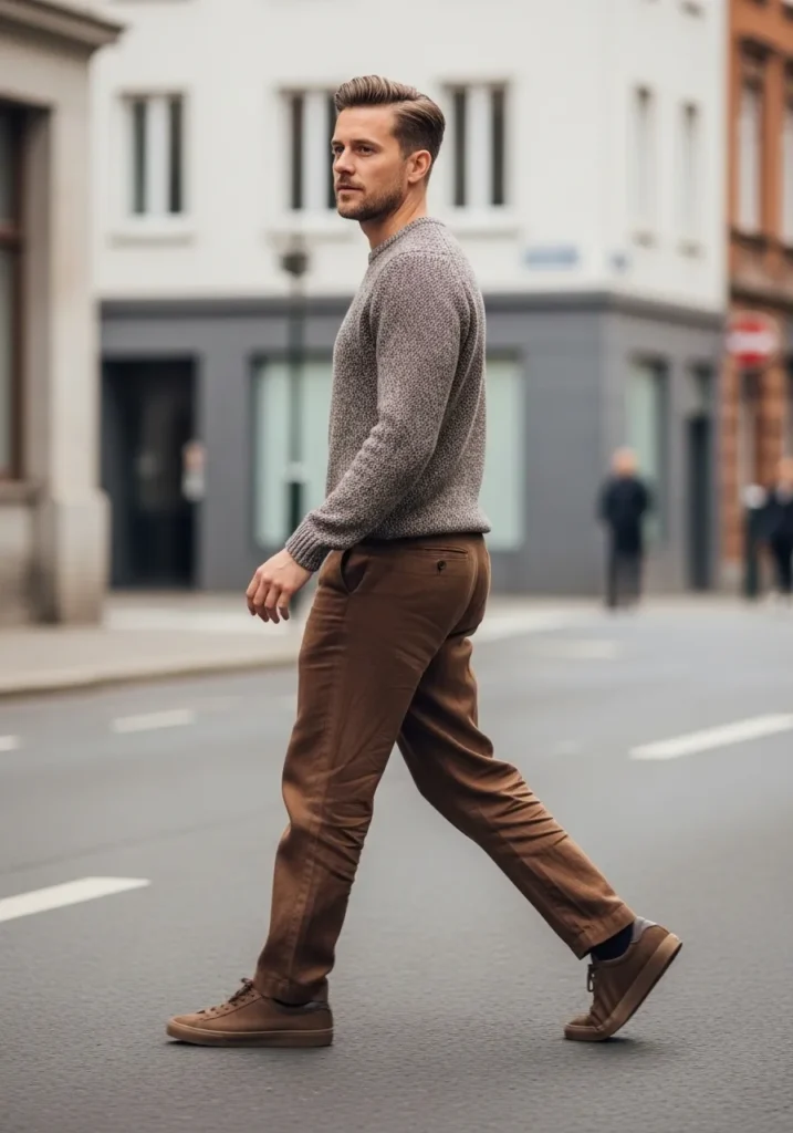 This look is all about quiet texture and easy confidence. He is wearing slim brown trousers in a warm earthy tone with a soft matte finish and a clean straight fit. The fabric falls neatly with subtle creasing at the knees that makes it feel lived in and real. On top, he pairs them with a taupe textured knit sweater that adds depth without overpowering the outfit. Brown leather sneakers keep everything tonal and cohesive, creating a smooth head to toe palette that feels grounded and modern.