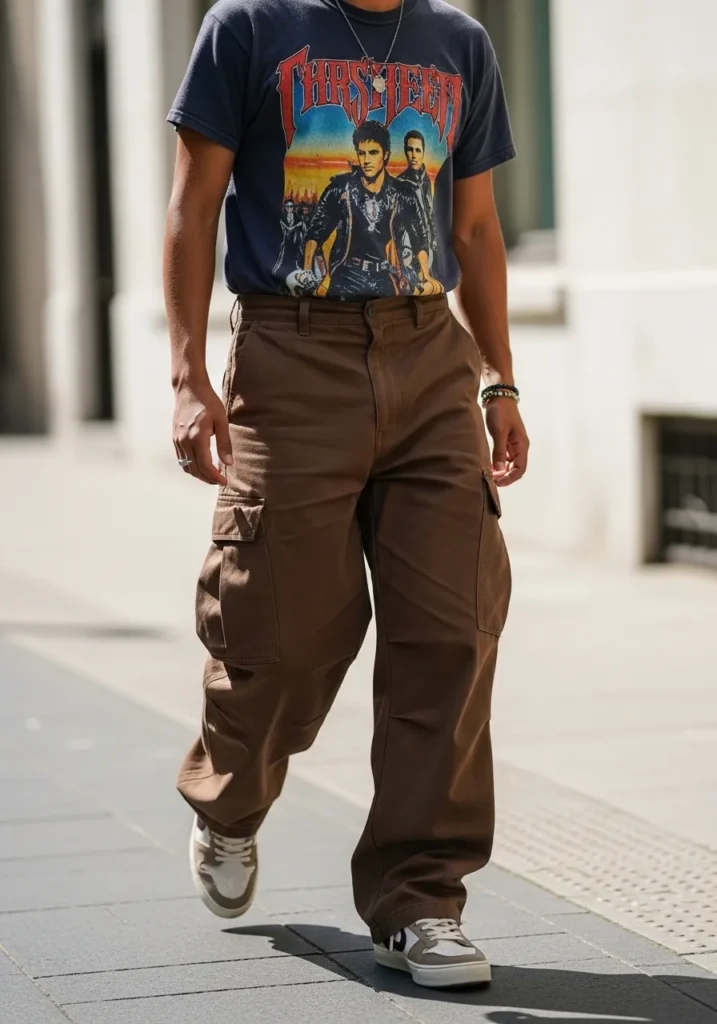 This look leans fully into bold street style attitude. He is wearing oversized brown cargo pants with roomy side pockets and a loose drape that creates strong movement as he walks. The fabric looks sturdy but soft enough to fall naturally around the legs. On top, he pairs them with a vintage inspired graphic T shirt in dark navy with a colorful print that instantly adds personality. Casual sneakers in neutral tones keep the outfit grounded and easy to wear, while simple accessories like layered bracelets and a necklace bring in that effortless cool factor.
