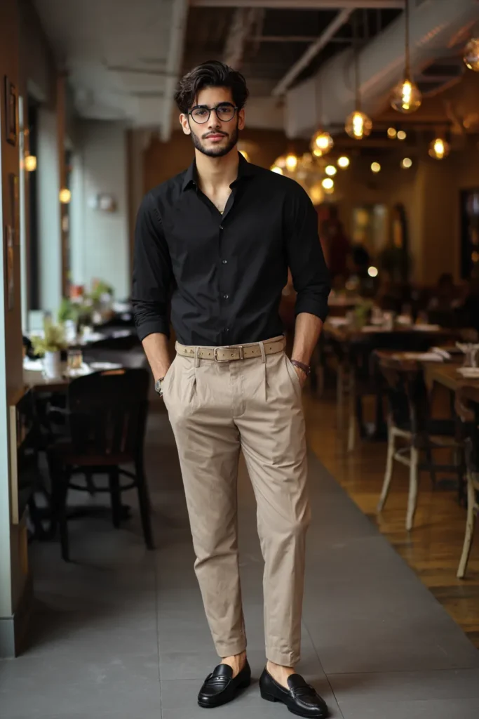 This ensemble relies on the timeless power of neutrals to make a really sharp statement. We have a crisp black dress shirt worn unbuttoned at the collar with sleeves rolled up for a relaxed vibe. The trousers are the real star here with their vintage-inspired pleats and light beige color that contrasts beautifully against the dark top. A tan leather belt coordinates seamlessly with the pants and sleek black loafers tie the whole look back to the shirt. The glasses add a final touch of intelligence and sophistication to the overall aesthetic.