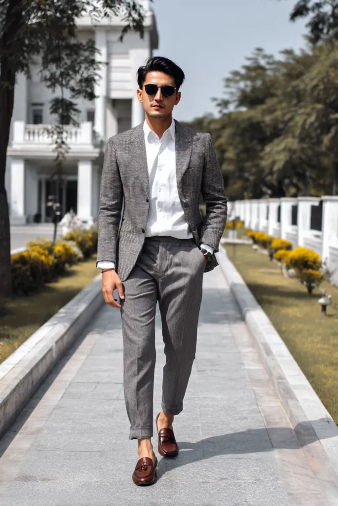 The Patterned Gray Suit and Loafer Combination