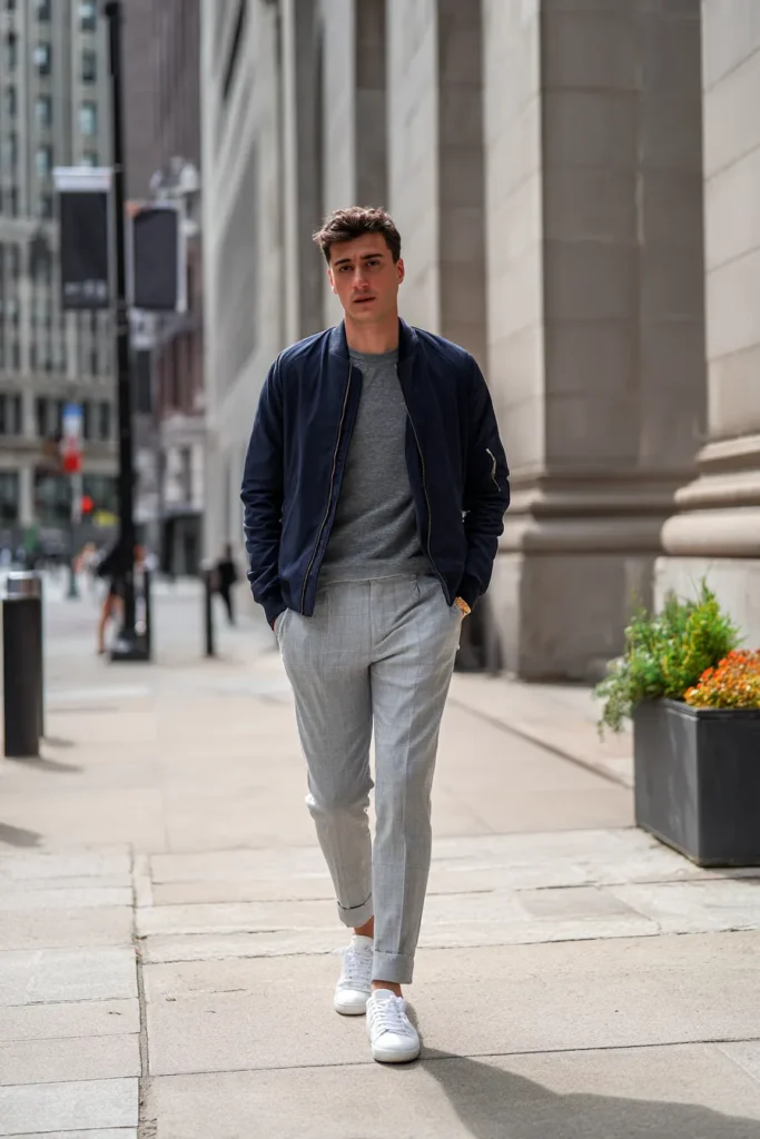 This outfit successfully bridges the gap between sporty street style and sharp tailoring which is a tough balance to strike. The top layer is a sleek navy bomber jacket over a simple gray crew neck t-shirt or thin sweater. Below that he is wearing beautifully tailored light gray trousers that are sharply creased and perfectly cuffed. Clean white leather sneakers finish the look keeping everything crisp and wonderfully modern.