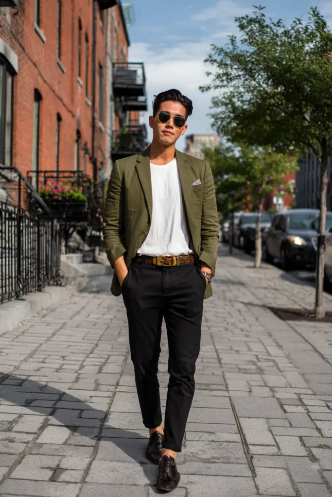 I totally love this look because that olive green blazer is just so unexpected and stylish. The color is incredibly flattering against the white t-shirt and the way he paired it with stark black pants makes the whole outfit look so crisp. Some people think black pants and a colorful jacket is tricky but this proves them wrong because the fit is so sharp. That unique patterned belt is such a fun touch too and it instantly elevates the whole vibe.