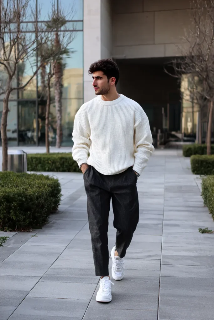 I think this combination is absolutely genius because it takes the idea of “cozy” and makes it incredibly high fashion. The oversized sweater is so romantic and snuggly and the dark tailored pants anchor the volume perfectly. The high contrast of the cream and the charcoal is instantly striking and flattering on every skin tone. It is the perfect outfit for a guy who wants to look stylish and refined without having to deal with wearing a blazer.