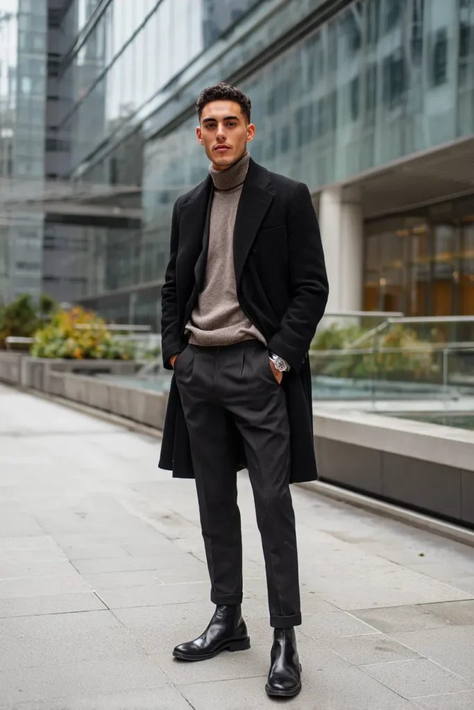 This final outfit is a masterclass in elegant winter layering using only timeless pieces. He is wearing a long black overcoat that adds incredible drama and warmth to the whole silhouette. Underneath is a cozy chunky turtleneck sweater in a beautiful light taupe color that contrasts perfectly with the dark outerwear. Tailored charcoal trousers and polished black Chelsea boots finish the look creating a powerful and refined urban aesthetic.