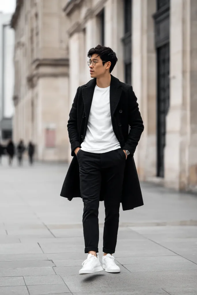 This look is the definition of city chic and sticking to the basics. It features a heavy black overcoat that adds immediate structure and drama to the silhouette while keeping things warm. Underneath creates a perfect contrast with a simple clean white t-shirt paired with black tapered trousers. The pants are cuffed just above the ankle to show off a pair of pristine white sneakers and round wire-rimmed glasses complete the intelligent aesthetic. The overall vibe is effortlessly cool and modern while strictly adhering to a monochrome color palette.