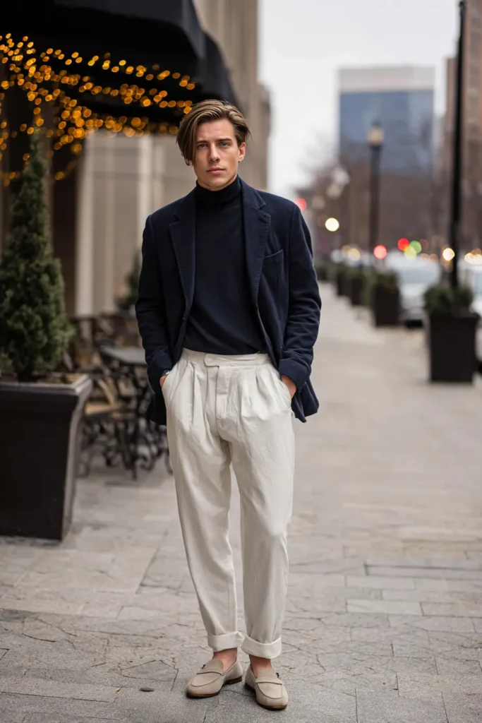 This look is pure sophistication with a deep navy blue blazer worn over a matching turtleneck sweater. The jacket has a lovely soft texture that contrasts perfectly with the crisp white pleated trousers. Those pants have a relaxed fit and are rolled up at the hem to highlight a pair of classic beige suede loafers. The whole ensemble channels a relaxed European vibe that feels timeless and fresh at the same time.