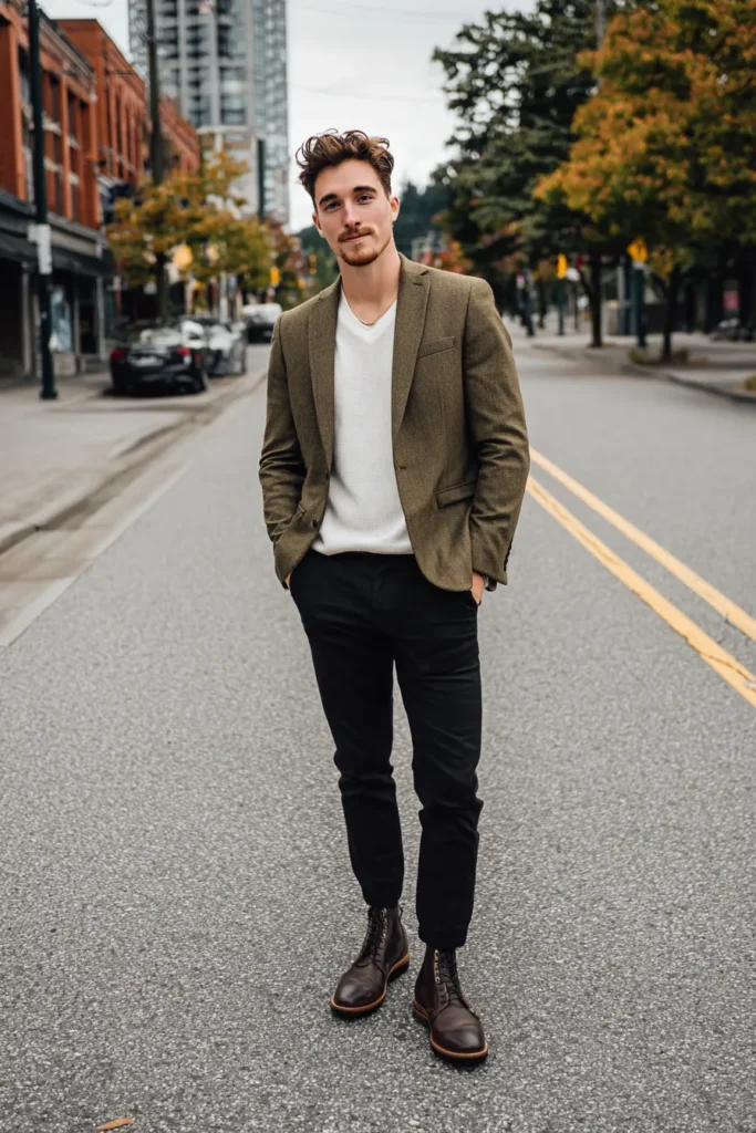 This is the perfect outfit for that crisp autumn weather. He is wearing a gorgeous tweed blazer in a rich olive or moss green color that gives the whole look a wonderful textured feel. Underneath is a cozy white V-neck sweater that keeps the neckline clean and bright. He paired this jacket with fitted black trousers and finished the look with chunky dark brown leather lace-up boots. It is a brilliant blend of rugged and refined elements creating an effortlessly cool silhouette that works perfectly for the season.