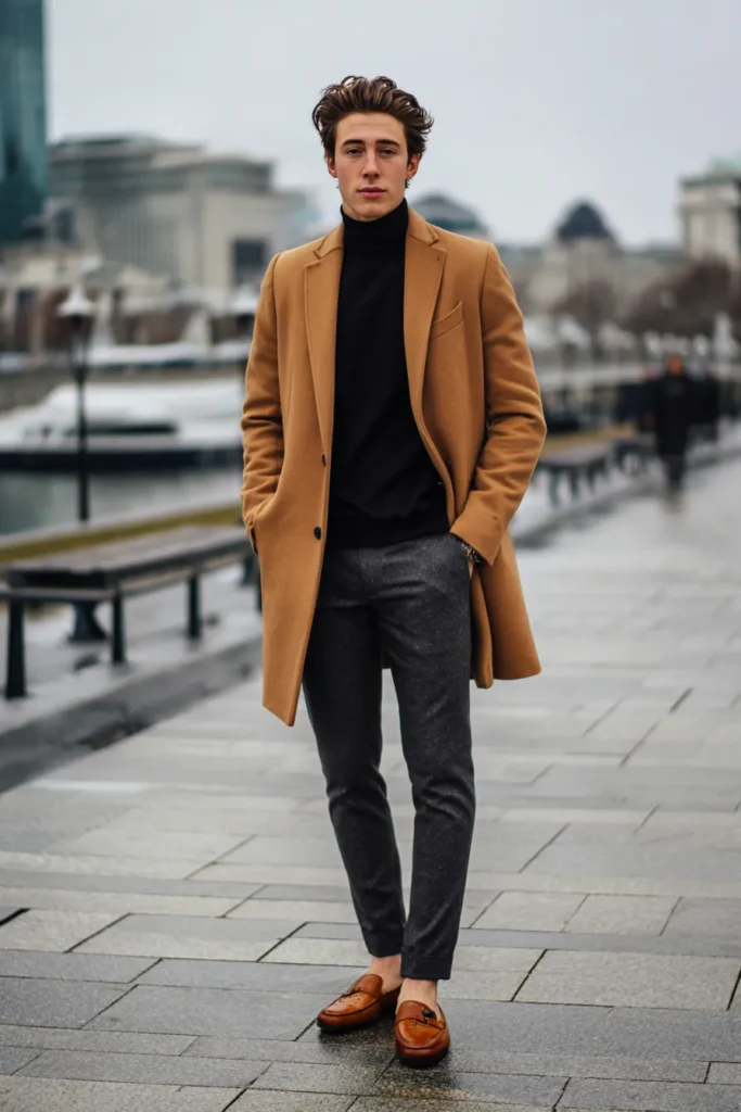 I honestly think this is the most flattering combination a guy can wear in the cold weather because the camel and black contrast is so striking and instantly refined. The turtleneck is a genius choice because it creates a long elegant line up to the jawline which looks amazing. Seriously if you want your partner to look like he stepped off a magazine cover this outfit is the answer. It is chic luxurious and perfectly tailored for any sophisticated outing.