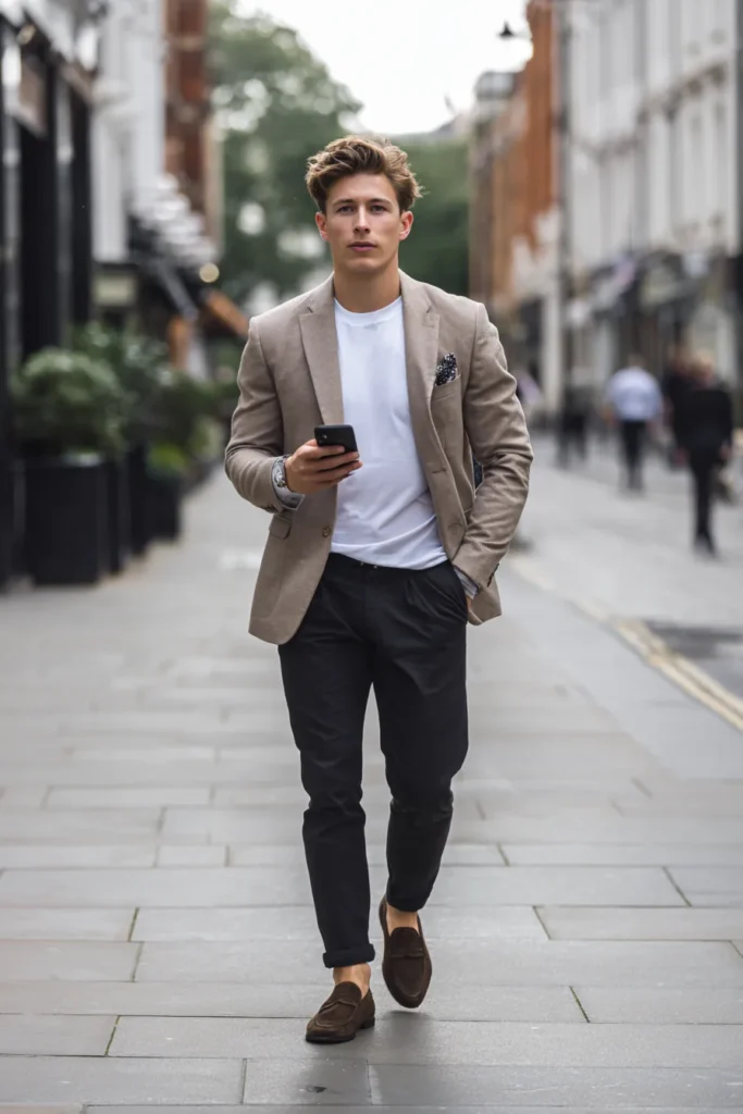 I think this look is a total must-have because it shows how easy it is to elevate a simple t-shirt. The blazer and the suede loafers make the outfit instantly dressy but the t-shirt keeps it from feeling stuffy or overly formal. It is the ideal mix of comfort and class which is exactly what we want our men to wear during summer evenings. The high contrast of the light jacket against the dark pants is incredibly sharp and so flattering.