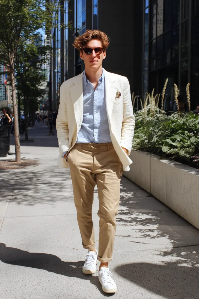 This outfit is the definition of breezy summer elegance perfect for a warm day outside. He is rocking a beautiful textured cream or off-white blazer layered over a light blue micro-patterned button-down shirt. The pants are tailored khaki chinos rolled up slightly to highlight the crisp white leather sneakers. Sunglasses and a patterned pocket square complete this sophisticated yet totally relaxed vacation look.