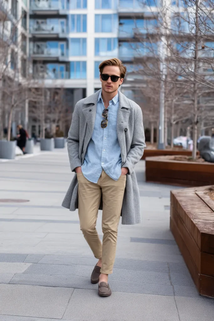 This outfit is a perfect lesson in stylish layering for those tricky transitional seasons. He is wearing a gorgeous light gray overcoat that drapes beautifully over a light blue and white striped button-down shirt. The coat’s soft texture contrasts nicely with the sharp fit of the khaki chinos below. Dark suede driving loafers complete the look adding a sophisticated casual touch that is just perfect for a city weekend.