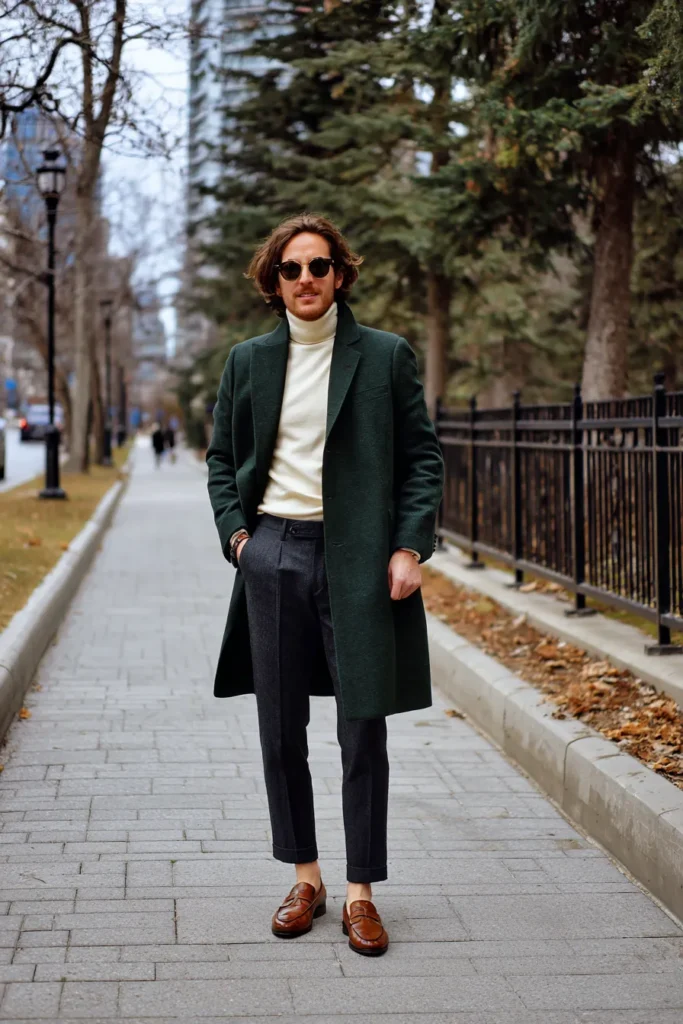 This look is absolute perfection for a crisp autumn or winter day. It features a gorgeously rich forest green long overcoat with a slightly textured fabric that looks warm and luxurious, paired with a soft cream or off-white wool turtleneck sweater underneath. The trousers are a tailored dark grey with a subtle pattern and a stylish cropped cut that shows off some seriously chic brown leather loafers. The outfit is polished off with some trendy round sunglasses and a casual yet refined air.
