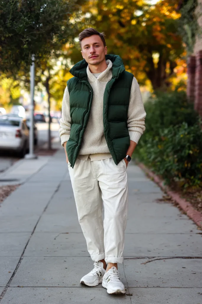 Oh, this is such a perfect casual look for that beautiful in-between weather where you need warmth but still want to feel light. This cozy outfit centers on a gorgeous, rich forest green puffer vest with a high collar, providing a great pop of color and structure. Underneath, there’s a relaxed, chunky knit cream or off-white sweater, and on the bottom, he’s wearing loose-fitting white or light beige trousers, casually cuffed. The outfit is completed with white sporty sneakers, leaning into a comfortable, modern vibe.