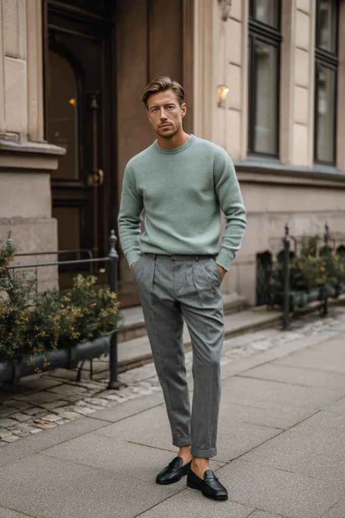 This outfit is the definition of quiet luxury and looks so effortlessly cool and sophisticated for any smart-casual setting. It features a simple crewneck sweater in a beautiful, light pastel mint green or icy sage color that contrasts wonderfully with the darker lower half. The sweater is paired with perfectly tailored grey wool trousers that have a relaxed yet structured fit and are cuffed at the ankle. The whole look is kept sharp with polished black leather loafers, cementing a refined, European-inspired aesthetic.