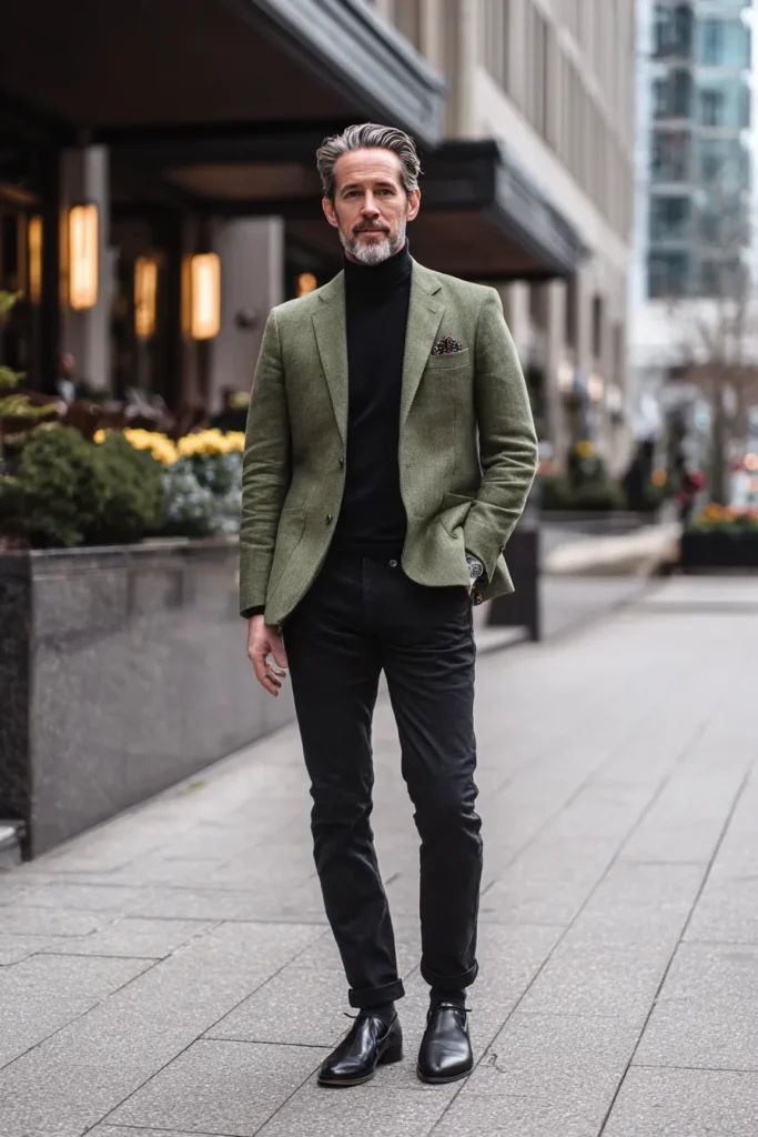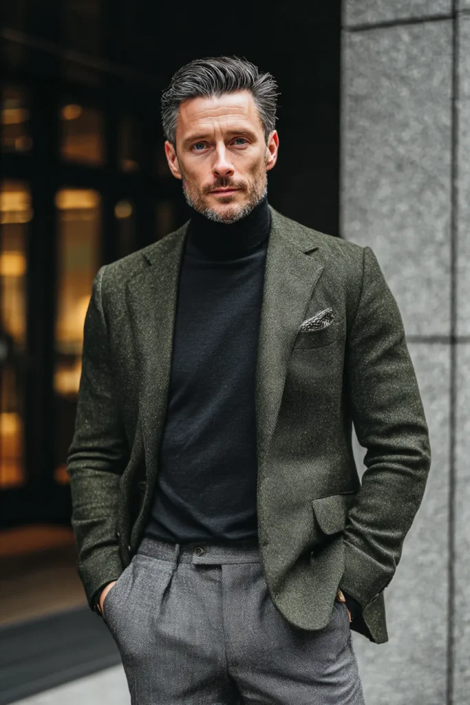 This outfit is the definition of refined cold-weather styling, blending classic tailoring with cozy textures for a look that’s incredibly sophisticated. The foundation is a sleek black fine-knit turtleneck sweater, which creates a clean, dark column. Over this, he wears a beautiful blazer in a deep moss or olive green tweed fabric, which has a wonderfully rich, textured feel. The ensemble is grounded by sophisticated, pleated trousers in a charcoal or heather grey wool, complemented by a patterned pocket square for a finishing flourish.