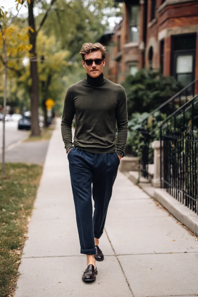 I think this look is incredibly flattering because of the streamlined silhouette and the sophisticated color blend—the deep olive green and rich navy blue complement each other perfectly. The fit of the turtleneck is spot-on, creating a clean, vertical line that automatically looks polished and expensive. The casual cuff on the trousers is such a great detail that modernizes the classic knitwear and loafers pairing, making the whole ensemble feel fresh and effortlessly stylish for a weekend stroll or date night.