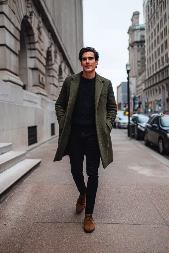 This is a fantastic option for staying cozy and looking incredibly chic on a chilly, overcast day. The focal point is a long, slightly textured overcoat in a beautiful moss or olive green tweed, which has a wonderfully rustic yet tailored feel. Underneath, he keeps it minimal with a dark grey or black crewneck sweater and sleek black trousers, making the coat the undisputed star. The ensemble is grounded by warm, cognac brown suede ankle boots, adding a touch of earthy contrast to the dark outfit.