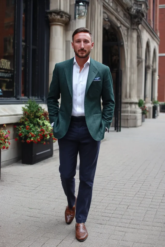 This is the ultimate smart-casual look that feels instantly polished and perfect for the office or a special event. The standout piece is a beautifully tailored blazer in a rich, textured forest green, which looks sophisticated and warm. Layered underneath, there is a crisp white dress shirt, worn casually open at the collar—no tie needed here for this modern vibe. He pairs the blazer with impeccably tailored navy blue trousers and warm brown leather loafers, adding a coordinating pocket square for a touch of class.