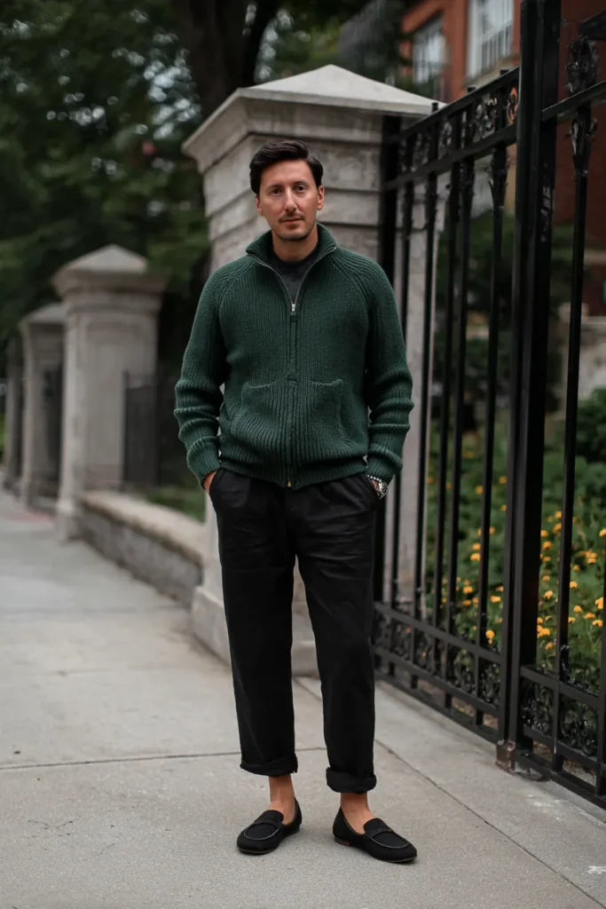 This is a fantastic option for a stylish, relaxed look that still feels incredibly intentional and put-together. The centerpiece is a zip-up cardigan or jacket in a rich, dark forest green color with a nice chunky knit texture and a funnel neck collar. He pairs this comfortable knitwear with perfectly tailored black trousers that are casually cuffed, creating a modern, streamlined silhouette. The entire ensemble is finished off with sleek black suede slip-on loafers, keeping the whole dark color palette chic and cohesive.